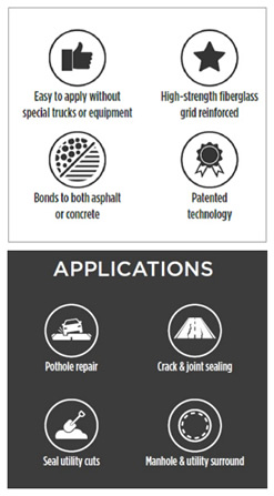 Unlike traditional methods, `ASPHA-PATCH’ is a cost effective product that properly contains, strengthens, and seals potholes, cracks, and utility cut repairs.
