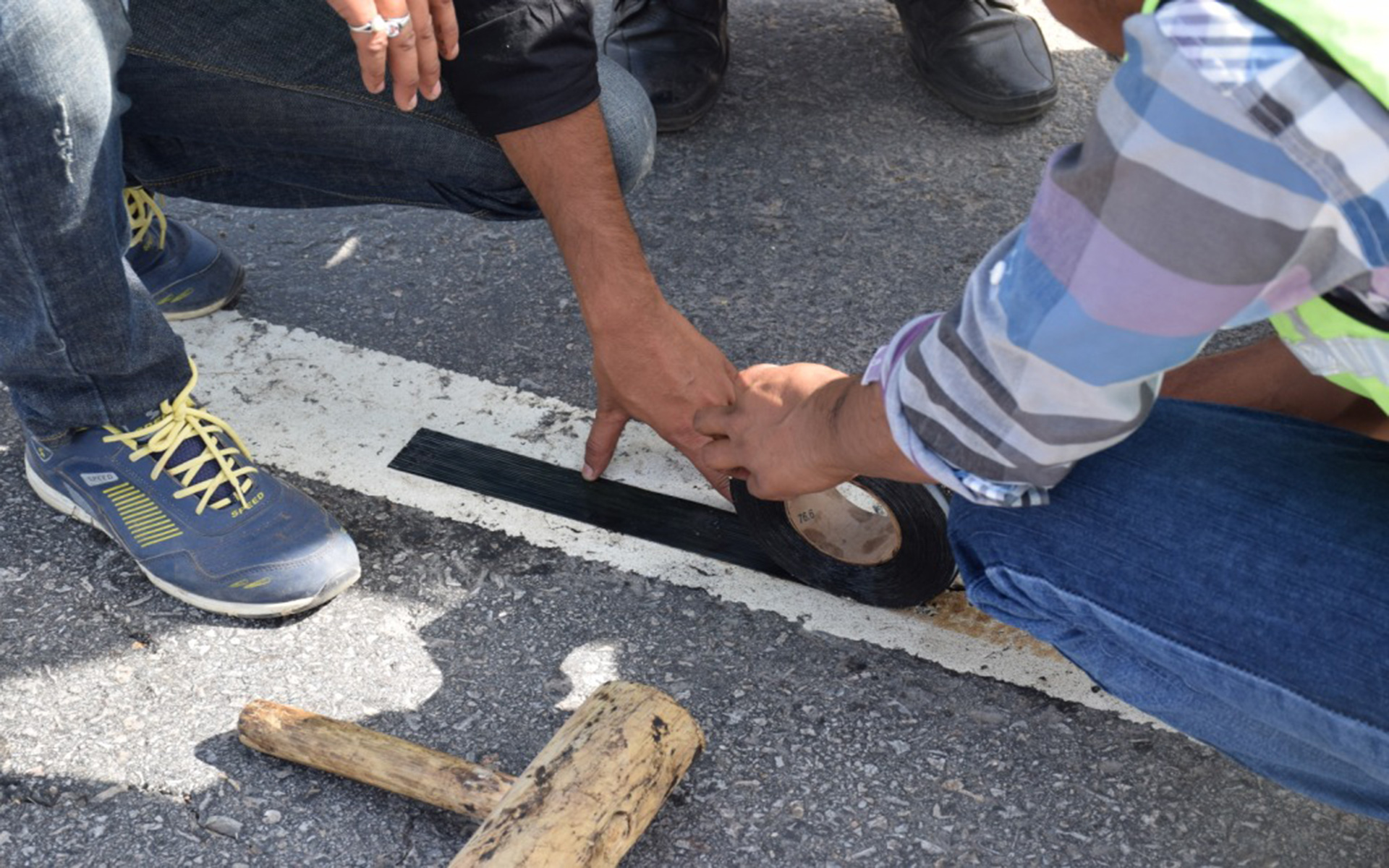 6. Rolling : Rolling with Hand roller force, rolling the tape on the ground, ensures that the 'BULL-BOND' Crack treating tape combined into Road, Highways, Bridges surface.